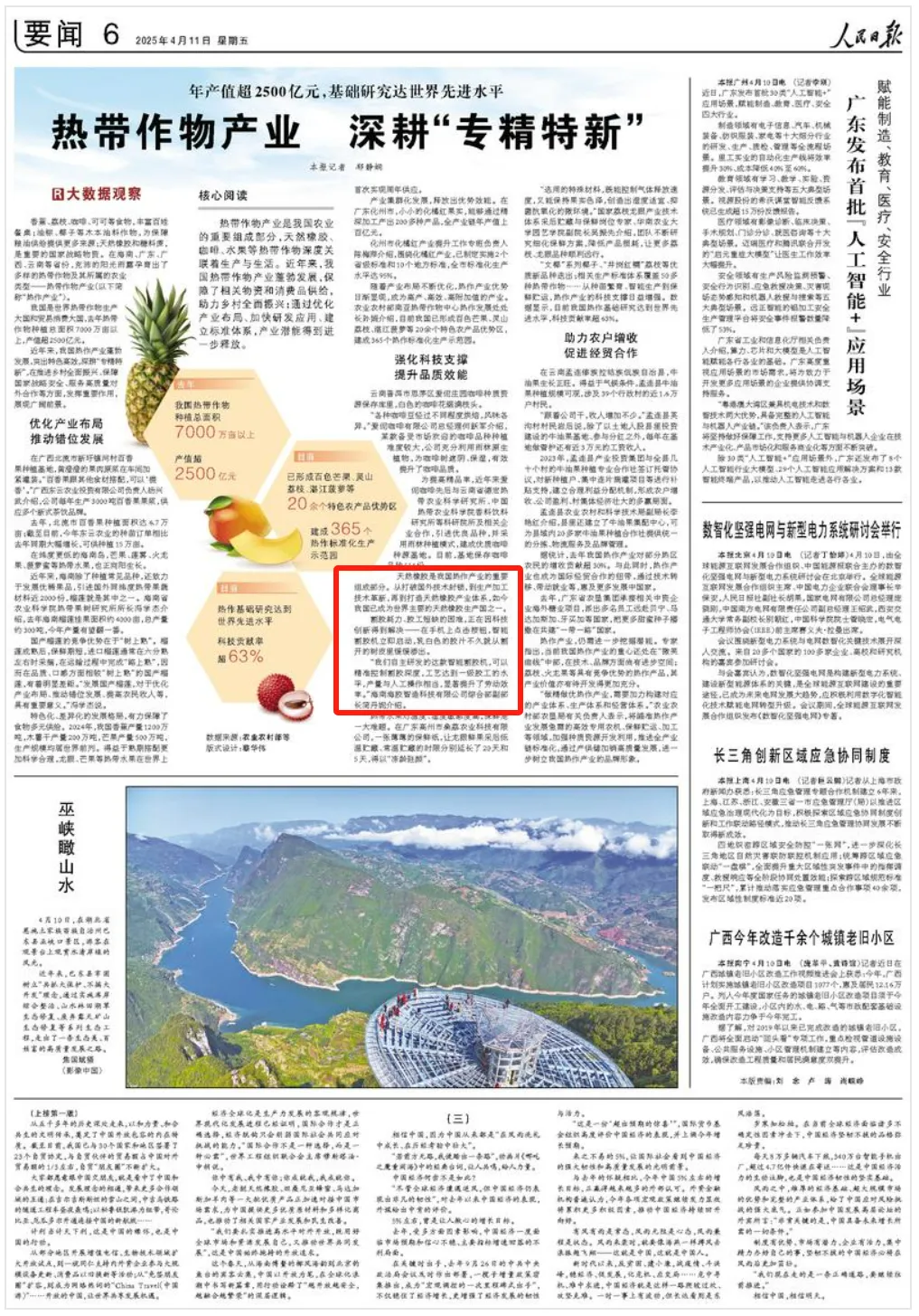 4月11日,《人民日報》要聞版刊發(fā)《熱帶作物產(chǎn)業(yè) 深耕“專精特新”》,重點提及海南橡膠的智能割膠機研發(fā)成果